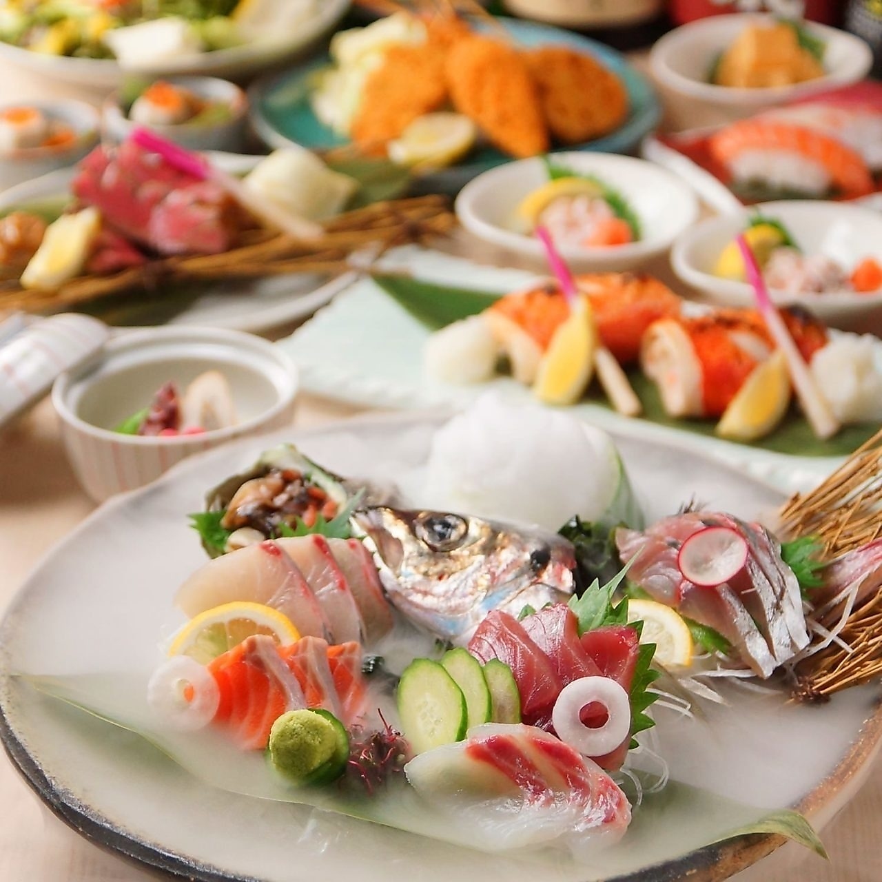 【各種飲み会、接待にもおすすめ】絶品和牛「黒毛和牛と牛タンの炙り焼き」や「銀鮭西京焼」他にも「特選 造里五種盛り合わせ」など全9品。魚舟自慢の和食を楽しんで頂ける宴会コースです。2時間飲み放題付き! ※飲み放題L.O.30分前 ◆お一人様+1000円で、おすすめ地酒も飲み放題に変更可能です。